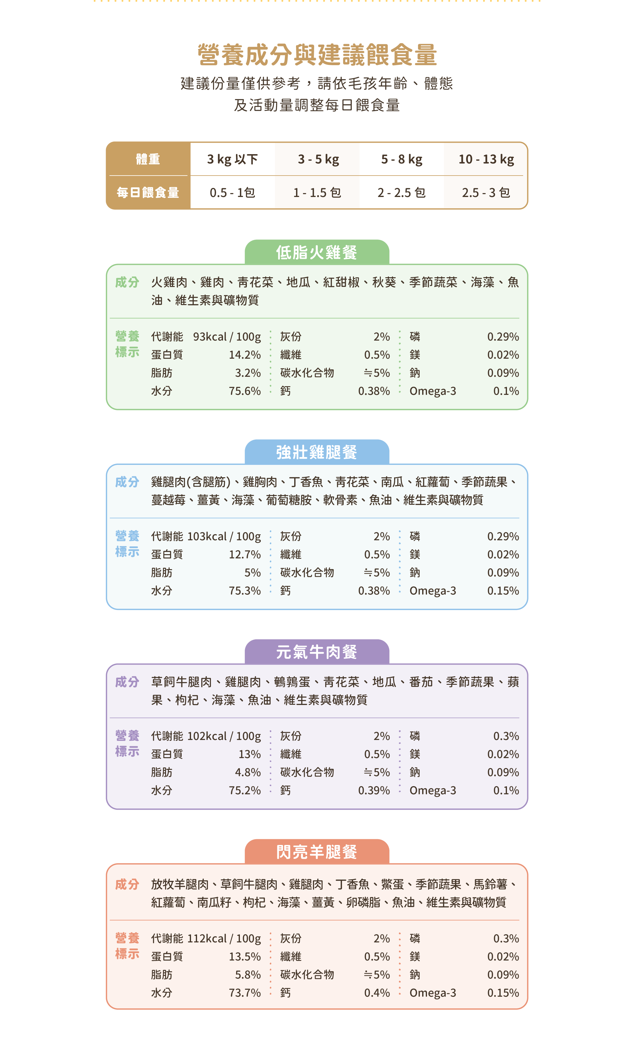 適用狀況:產品符合美國 AAFCO/NRC 成幼犬營養標準,可長期作為主食。